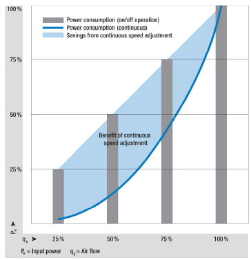 Turn off half of the fans=50% air flow=50% power consumption